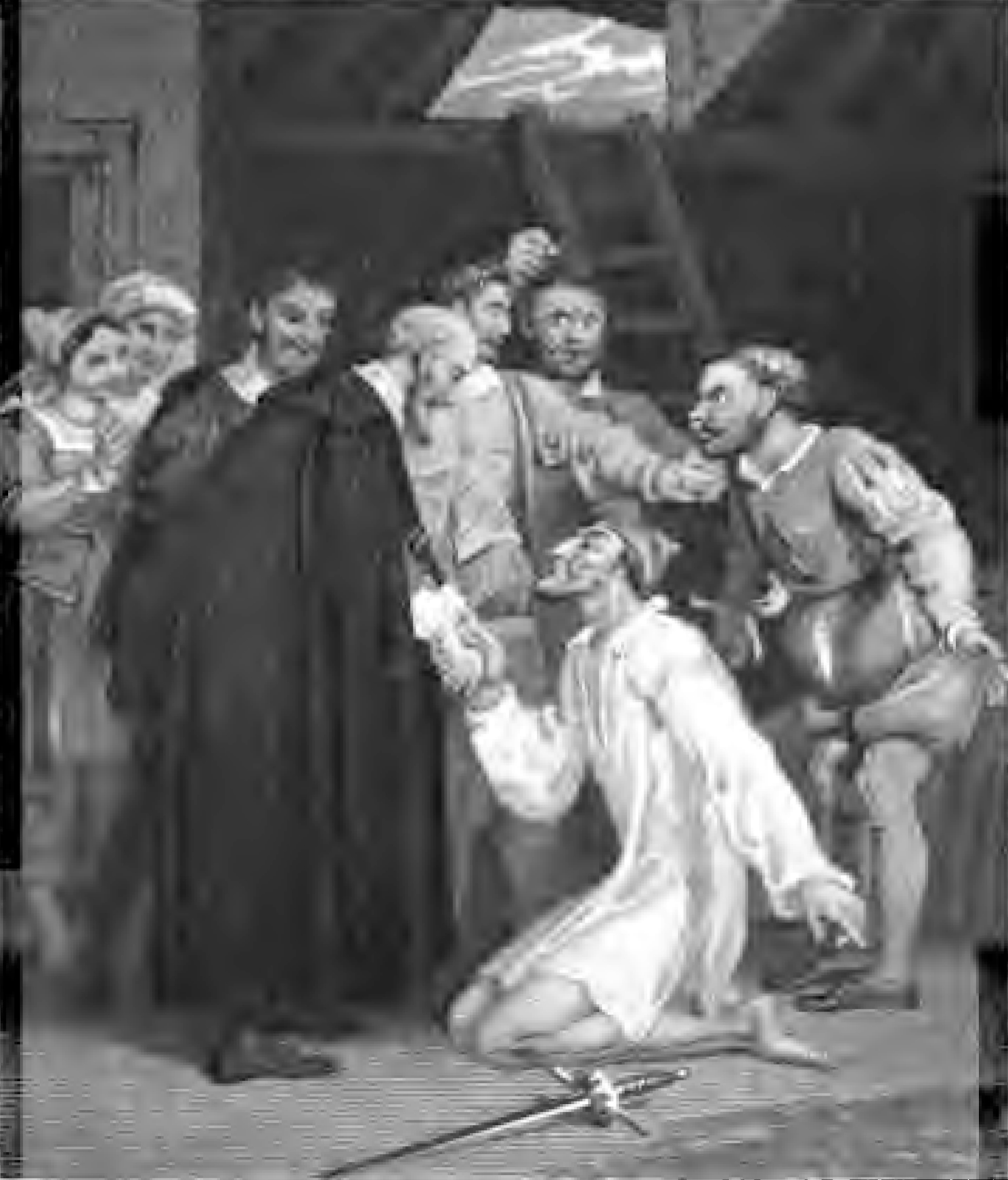 Don Quixote (centre) falls to his knees in a lengthy white bed shirt and a little red cap having shred the wineskins of the innkeeper. The priest (left) dressed in black, takes Quixote's right hand in his own and talks to him. To the right, Sancho Panza bends slightly, incensed at the promises his master has made to him, which he now realize were made in disillusioned faith. The innkeeper (in the background by the ladder) raises his right hand and clenches it into a fist in anger with Quixote for destroying his wineskins, but he is restrained by Cardenio. In the background, a ladder leads up and out of the cellar. The barber, Dorotea, and the innkeeper's wife are pictured on the left.