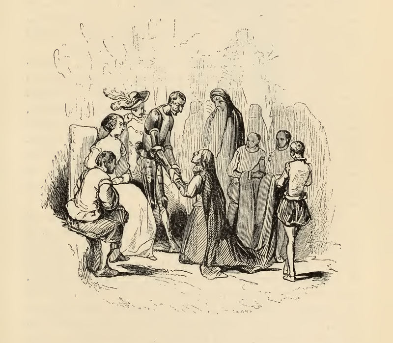 Don Quixote, clad in armor, takes countess Trifaldi's hands in his own. The countess is pictured as an older woman clad in black robes, kneeling on the ground. The three corners of her robe are held by three pages who stand at the ready behind her on the right. On the left, Sancho Panza sits on a rock next to the duchess, who sits regally on a chair, and the duke who stands next to Quixote in his plumed hat. In the background, behind the countess, stands a very tall man with a very long and thick white beard, this is the countess' squire.