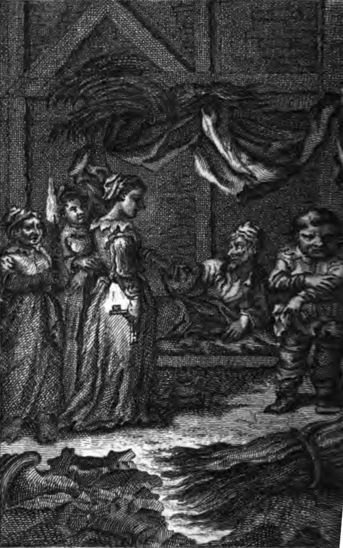After being beaten by a group of ruthless Yanguesans (people that come from Yanguas, a municipality in the province of Soria, Castile and León), Don Quixote and Sancho Panza arrive at an inn to seek hospitality. The innkeeper, seeing the bruises upon Quixote's body enquires as to what has transpired, Sancho Panza lies that the bruises came about after falling off of a horse and landing upon a misshapen rock. The innkeeper's wife (the rightmost of the three women), a servant of the inn named Maritornes who held a candle for seeing (leftmost of the three women), and the innkeeper's daughter (middle of the three women) made Quixote a sorry bed of four wooden boards in the horse loft and a flock bed no thicker than a quilt. In this wretched bed was Don Quixote laid and the innkeeper and her daughter set to work wiping his bruises with wet cloths. Sancho Panza notes that although he himself has not been beaten to the same degree as his master, the fright alone has made him bruised, feeling his arm to check said bruises.