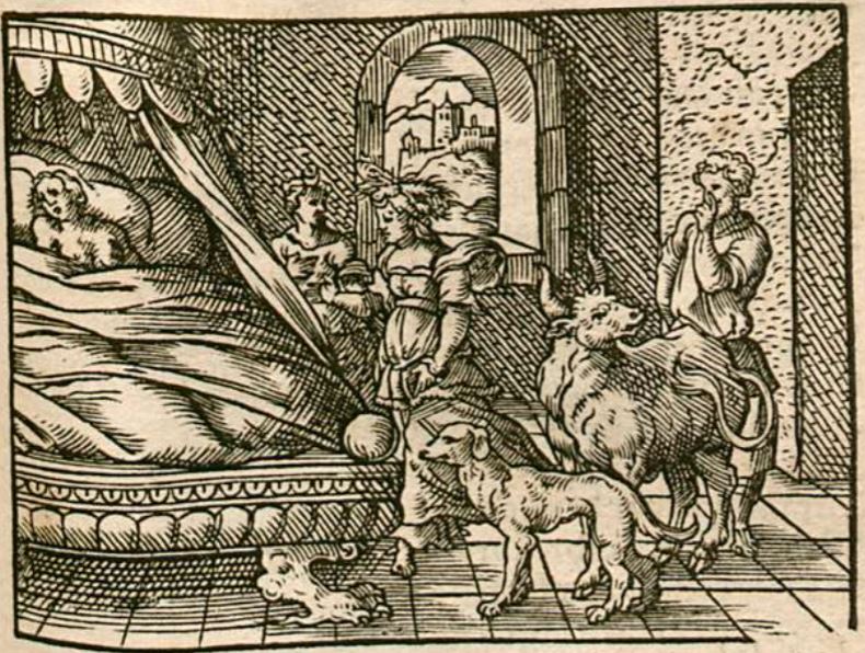 This engraving illustrates a pregnant Telethusa sleeping in her bed. Telethusa is worried about giving birth as her husband, Ligdus, vowed to put the child to death if it is to be a girl. Many Egyptian deities appeared to Telethusa in a dream, including Isis, Anubis, Apis, Harpocrates and Osiris. The deities are depicted surrounding the bed of Telethusa in the engraving. Isis speaks to Telethusa and tells her that no matter the outcome of the gender, she must raise the baby. Isis promises that everything will be okay, and no harm will come to the child after birth.