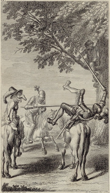 Don Quixote defeats the Knight of the Mirrors (Sansón Carrasco), knocking him off his mount. Meanwhile Sancho Panza (right background), startled by the big nose of the Knight of the Mirrors’ squire (Tomé Cecial, left foreground), climbs into a tree. Signed by D.-N. Chodowiecki (illustrator) and D. Berger (engraver), dated 1779. Plate 10. Part 2, ch. 14.
