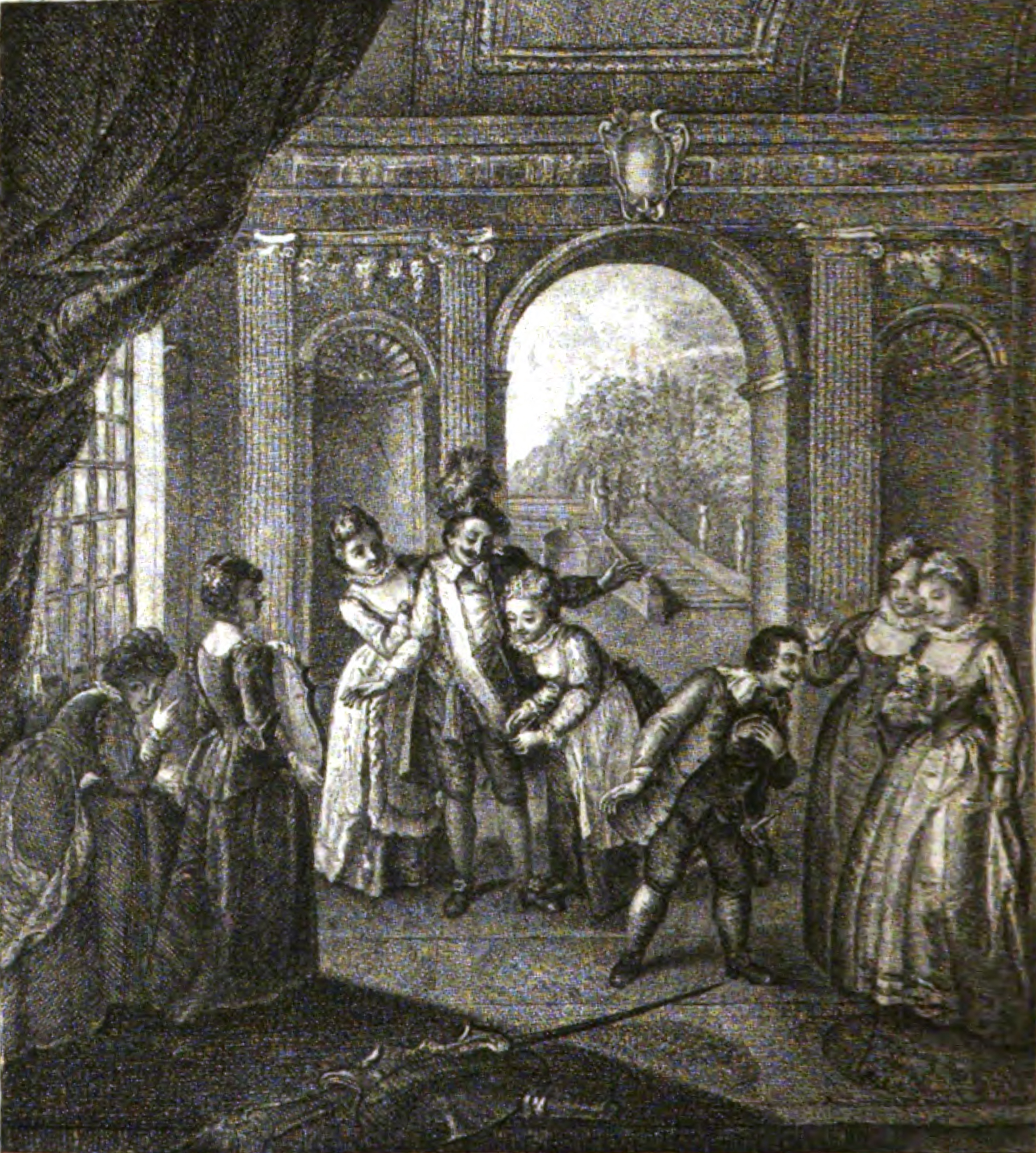 While in the accommodations of the Duke and Duchess, Don Quixote and Sancho are met by six duennas, the likes of which Sancho Panza refuses to be touched by. Two of the Duenna's in the middle aid Don Quixote in wearing formal attire, while a third Duenna to the left holds up a mirror. To the right, Sancho Panza politely refuses the services of two Duenna, placing his cap to his heart in solidarity.