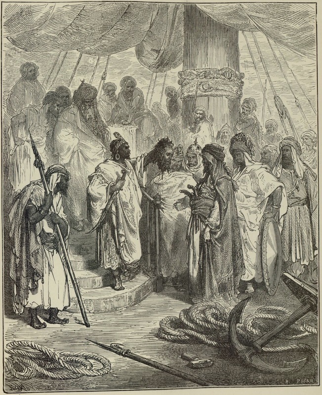 The illustration represents part of the captive’s tale: a group of Arabs bring Juan de Andrea Doria’s head to the commander of the Turkish fleet, who orders the two who brought him the head hanged. This confirms the Spanish proverb: ‘For the treason we are grateful, though we find the traitor hateful.’ The Arabs had betrayed Juan’s trust after the Goletta fortress fell, promising to take him to Tabarca dressed as a Moor. Signed by G. Doré (illustrator) and H.-J. Pisan (engraver). Part 1, ch. 39.