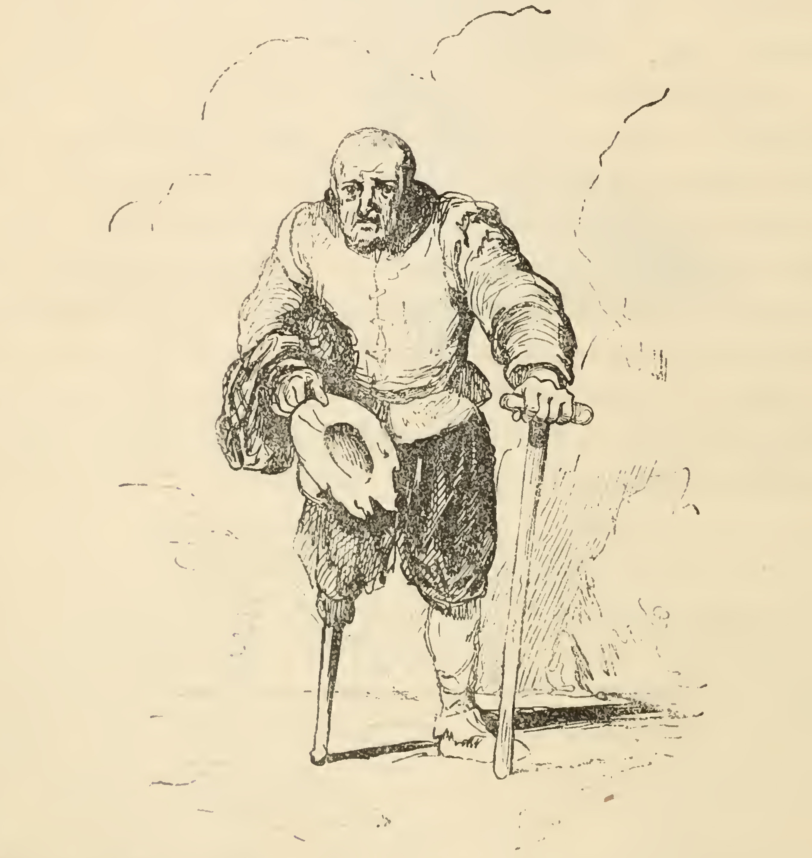 A bald old one-legged man walks forward, his back hunched. He holds a cane in his left hand and a hat in his right, with a jacket draped over his forearm. The image is occasioned by Don Quixote saying "Observe, my son, that a soldier had better smell of gunpowder than of musk ; and if old age overtake you in this noble profession, though lame, maimed, and covered with wounds, at least it will not overtake you without honour, and such honour as poverty itself cannot deprive you of."