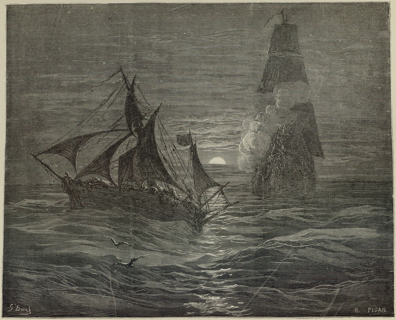 In the bright moonlight, the captive, Zoraida, and the crew see a square-rigged ship (a French corsair vessel) approaching them. Without warning, the ship fires two cannons loaded with chain shot. The first cuts their mast in two and the second strikes them amidships. Signed by G. Doré (illustrator) and H.-J. Pisan (engraver). Part 1, ch. 41.