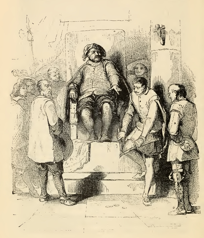During Sancho Panza's role as governor of Barataria, he sits upon a high regal chair (middle) with a wand in his right hand and points towards a cane with his left hand. A group of people gather around and behind the throne to see and hear Sancho's decree. On the left and right of the foreground there are two old men who have approached Sancho for the purpose of having their altercation resolved. One of Sancho's men takes the governor's order and snaps a hollow cane in half with his knee, from which coins fall to the floor. At the top right on a pillar hangs a cross depicting the crucifixion of Christ.