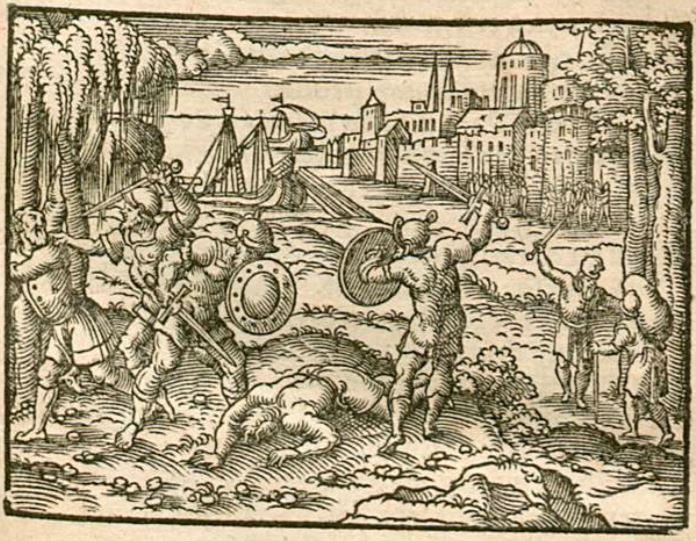 This image illustrates the violence that ensues after the time of the Silver Age. The image demonstrates the Bronze Age and Iron Age, where humankind began to indulge in warfare and became fiercer than in previous ages. As shown in the image, there are soldiers battling one another, with one soldier depicted slain on the ground. There are massive fortifications in the background as their desires for bigger and stronger shelters grew. In the far background, there are ships illustrated on the water, as the people of the Bronze Age began cutting down trees in order to construct the ships. The image is to signify the changing ways of the world and the violence that will come from humankind.