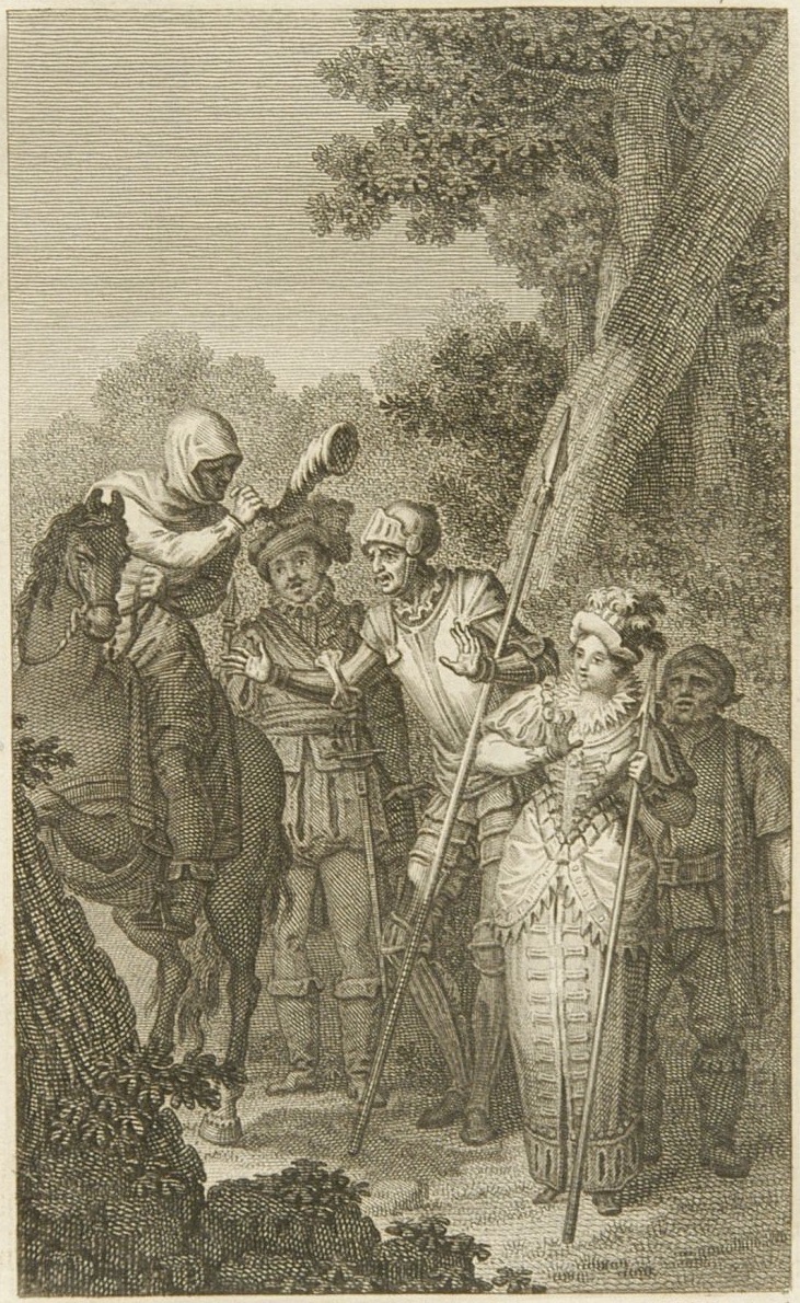 A postillion dressed as a demon approaches the hunting party, playing a huge, hollow animal horn that emits a harsh and terrifying sound. The devil announces the arrival of the enchanted Dulcinea and the gallant Montesinos. The duke and Don Quixote are depicted with expressions of surprise; the duchess and Sancho Panza, fear. Signed by J. Rivelles (illustrator) and A. Blanco y Asensio (engraver). Part 2, ch. 34.