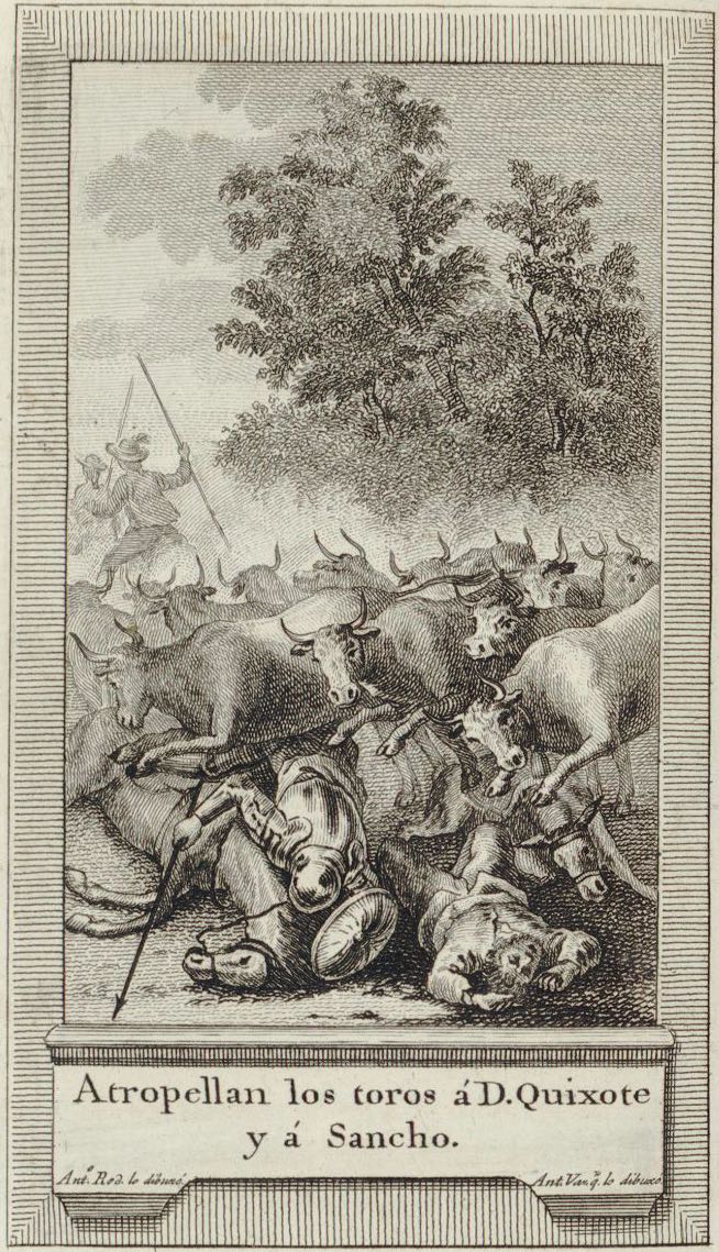 After Don Quixote confronts some herders on the king’s highway to Zaragoza, a herd of bulls tramples him, Sancho Panza, and Rocinante. Signed by A. Rodríguez (illustrator) and B. Vázquez (engraver). Part 2, ch. 58.