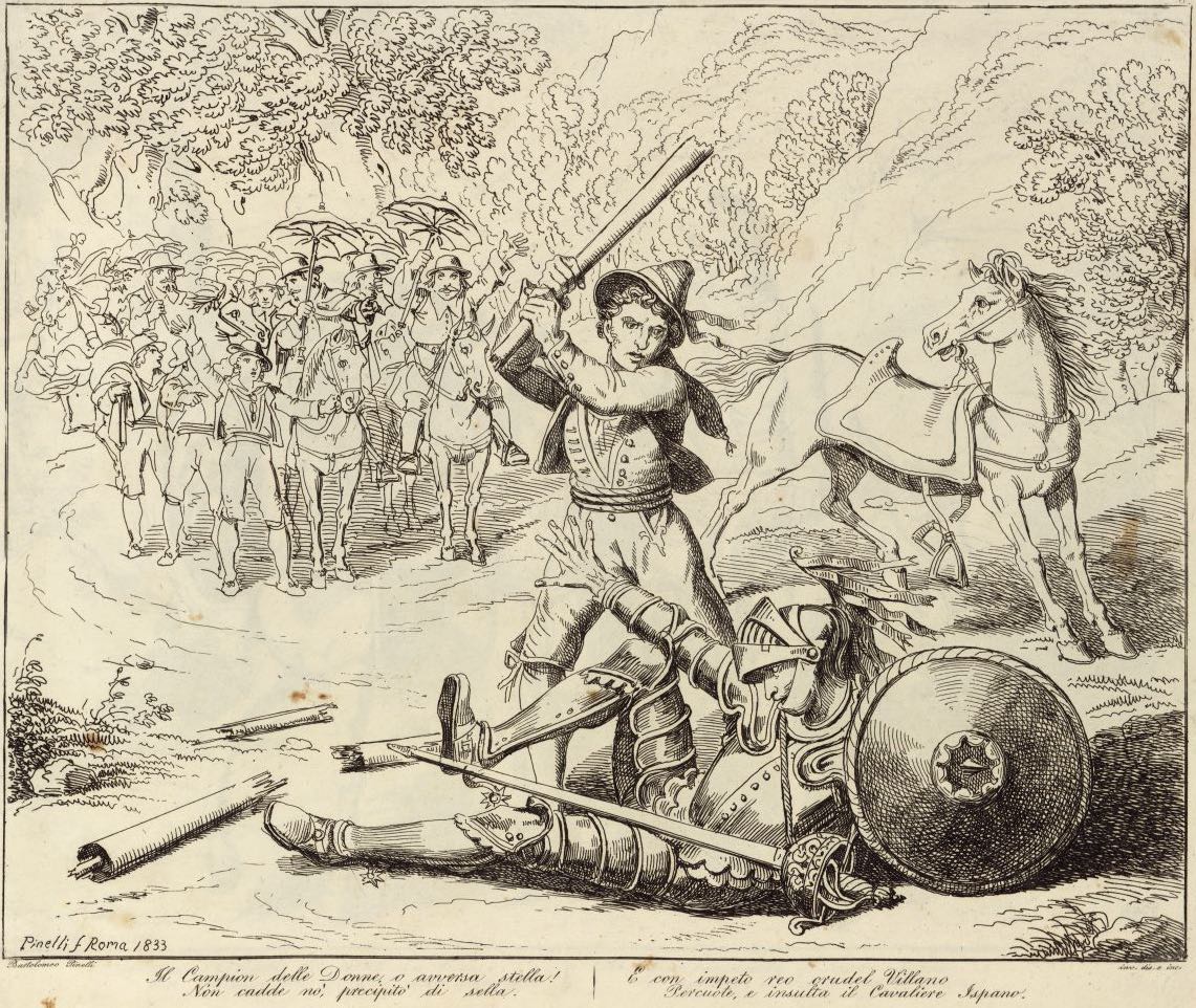 Il Campion delle Donne o avversa stella! / Non cadde nò, precipitò di sella. / E con impeto reo crudel Villano / Percuote, e insulta il Cavaliere Ispano.