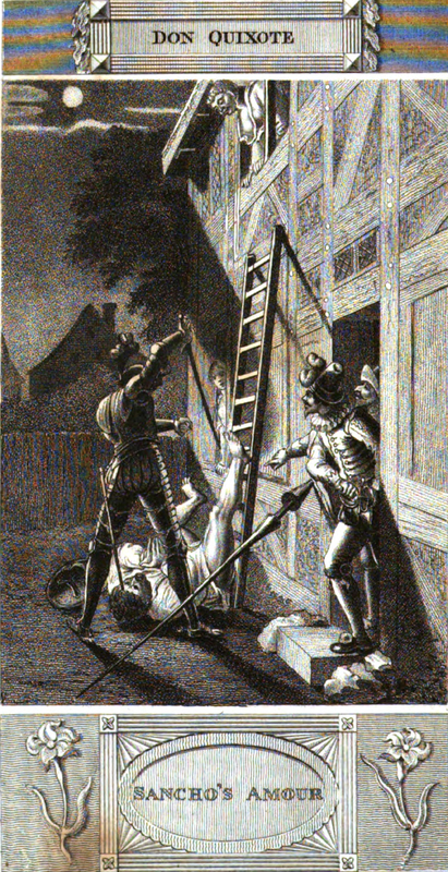After being brought back to his home in La Mancha with the purpose of curing Quixote of his madness, the priest and the barber try to see whether Quixote is still obsessed with knight-errantry. At the entrance to the home of Don Quixote, Sancho Panza tries to climb a ladder to see his master but is refused entry by Quixote's niece and housekeeper who send him tumbling back to the ground. The barber, priest and Quixote all run to the entrance to see what the noise is about. Sancho Panza lies on the ground next to his ladder, having fallen from its peak. The housekeeper looks down upon Sancho, satisfied in her defence of the house, whilst Quixote's niece looks upon Sancho out of a left-hand ground floor window.