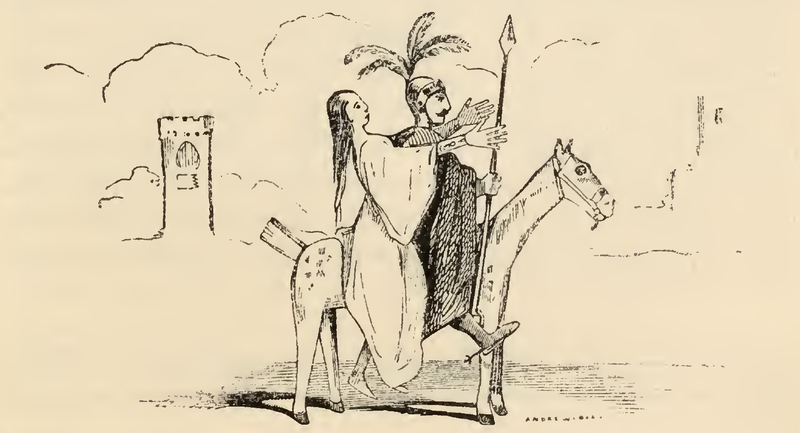 In master Peter's puppet show Don Gaiferos, clad in armor, (right) rides a horse with a spear and a magnificent feathered helm. Melisandra (left) wearing long white robes of the Algerian make sits behind him on his horse, and clasps her arms about his shoulders till they cross and meet over his breast, that she may not fall, though her puppet arms only allow so much limber movement. In the background on the left stands the tower she has just recently escaped from.
