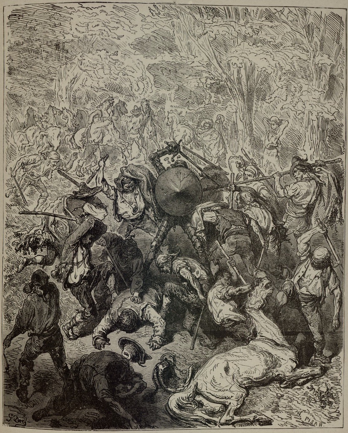 The Yanguesans, seeing themselves attack by only two men, surround Don Quixote and Sancho Panza and rain blows down on them with their staffs. Signed by G. Doré (illustrator) and H.-J. Pisan (engraver). Part 1, ch. 15.