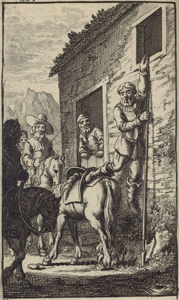 Don Quixote falls from Rocinante and hangs by his hand, tied to a window. Four travellers, servants of Don Luis’ father, arrive to the inn and Rocinante moves to smell one of the mares. The innkeeper appears at the window, having heard Don Quixote shouting. The plate is placed in ch. 41 in the text, but the scene is from ch. 43. Unsigned. Part 1, ch. 43.
