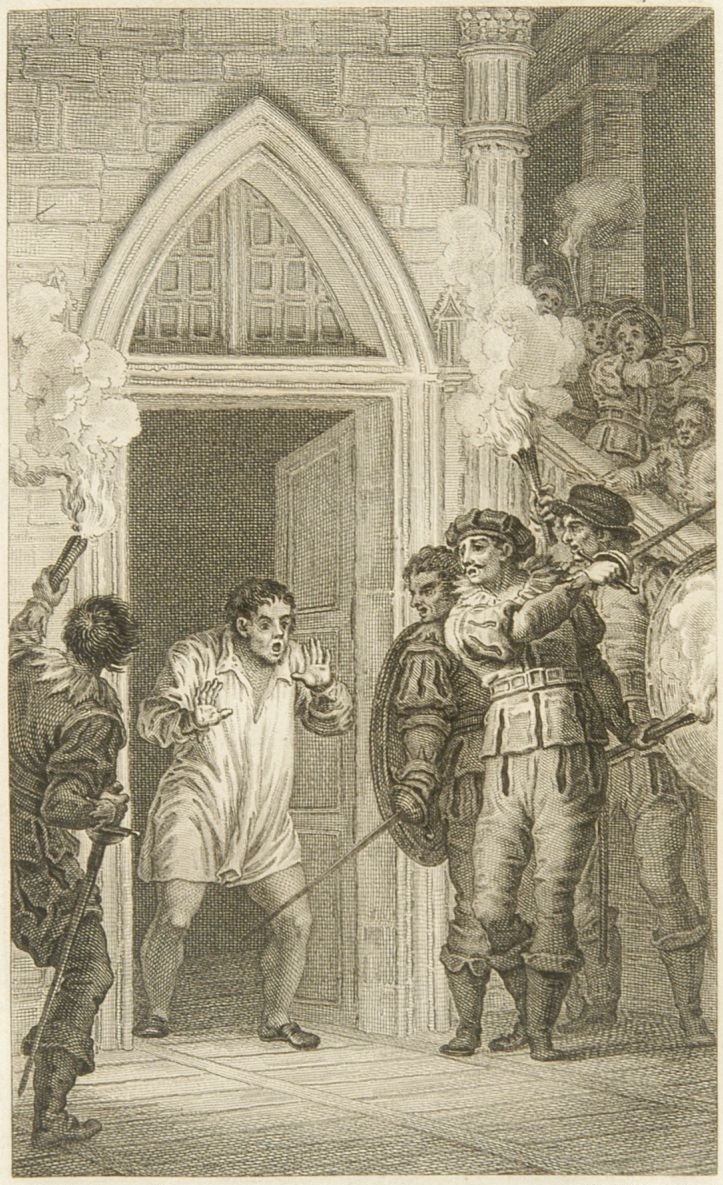 Sancho Panza, wearing his nightshirt, is awakened by soldiers who inform him of the invasion of Barataria Island. The architecture is well detailed. Signed by J. Rivelles (illustrator) and A. Blanco y Asensio (engraver). Part 2, ch. 53.