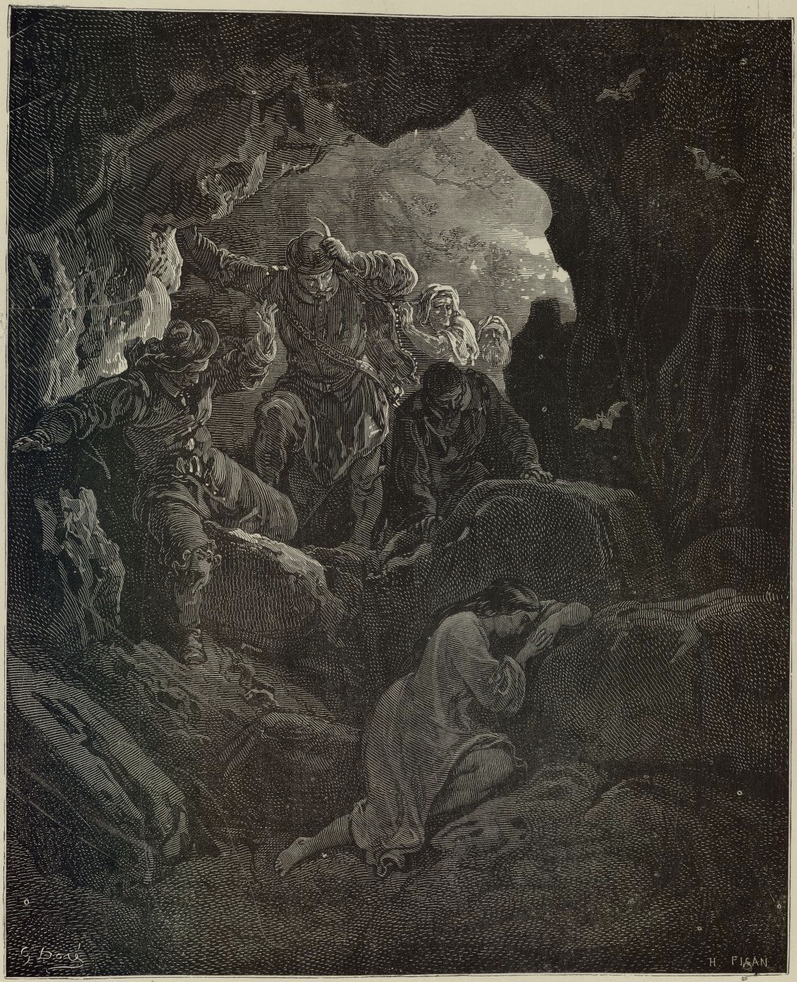 The illustration represents part of the story told by the goatherd Eugenio: after searching for three days, the villagers find Leandra in a cave, wearing only her chemise and without the money or jewels she had taken from the house. She had fled to the cave with Vicente de la Rosa, where he robbed and abandoned her. Signed by G. Doré (illustrator) and H.-J. Pisan (engraver). Part 1, ch. 51.