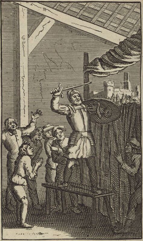 - Don Quixote, standing on a bench, attacks the puppets of Maese Pedro’s theatre while several astonished theatregoers watch him. Maese Pedro appears from hehind a curtain. Unsigned. Part 2, ch. 26.