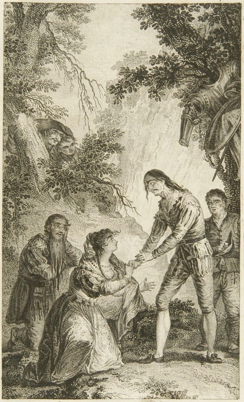 In Sierra Morena, princess Mimicona (Dorotea) kneels before Don Quixote and begs for his help. The barber is disguised as Dorotea’s page with a fake beard (an oxtail). In the background, the knight’s armour hangs in a tree and the priest and Cardenio watch the scene, hidden behind some shrubs. Signed by J. Rivelles (illustrator) and T. L. Enguídanos (engraver). Part 1, ch. 29.