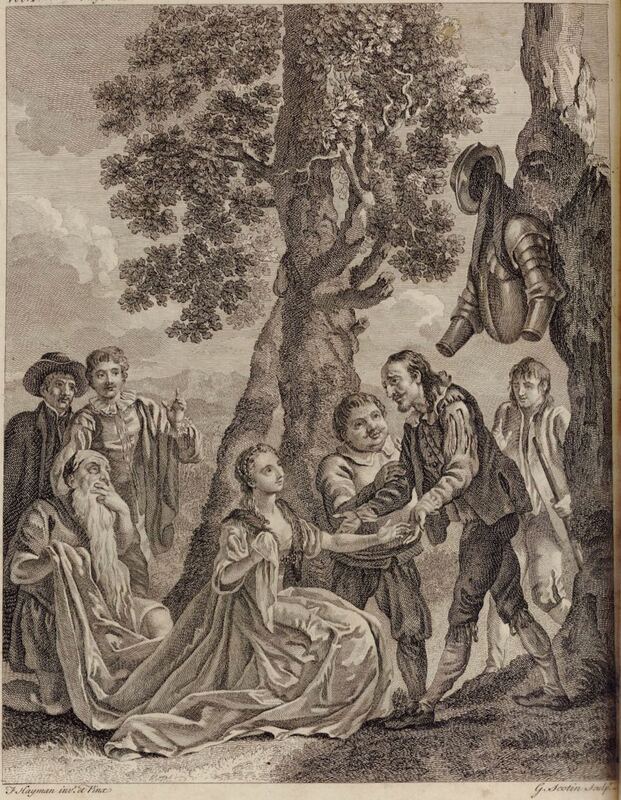 Princess Micomicona (Dorotea) kneels before Don Quixote, while Sancho Panza explains who she is. The barber, disguised with a beard, appears as her squire. In the text, the priest and Cardenio are hidden from view, while in the illustration they are pictured in the scene. Don Quixote’s armour hangs on a tree, as a reference to his penance in the previous chapter. Signed by F. Hayman (illustrator) and L. G. Scotin (engraver). Part 1, ch. 29.