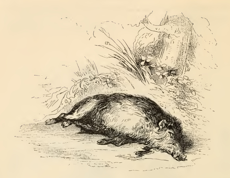 - A large tusked boar is laid to rest in the forest on the dirt with only the whites of its eyes visible, a puddle of blood forming by its neck.