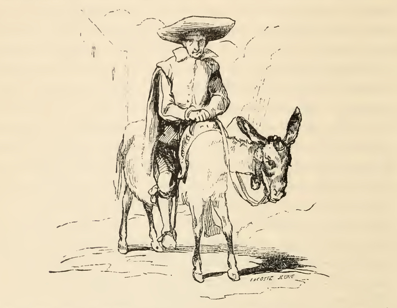 Don Quixote is procured a famous scholar and a great lover of books of chivalry, to lead them him the mouth of the cave of Montesinos. The scholar (pictured) came, wearing a wide hat and a long cape, mounted on a donkey big with foal whose pack-saddle was covered with a doubled piece of an old striped carpet.