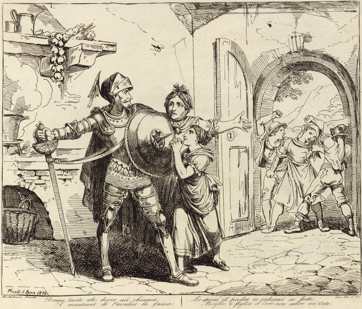 Donne, tacete alto dover mi chiama / A mantener di Cavalier la fama. / Lo sposo, il padre io salverei se foste / Moglie, e figlia d'Eroi: non salvo un Oste.