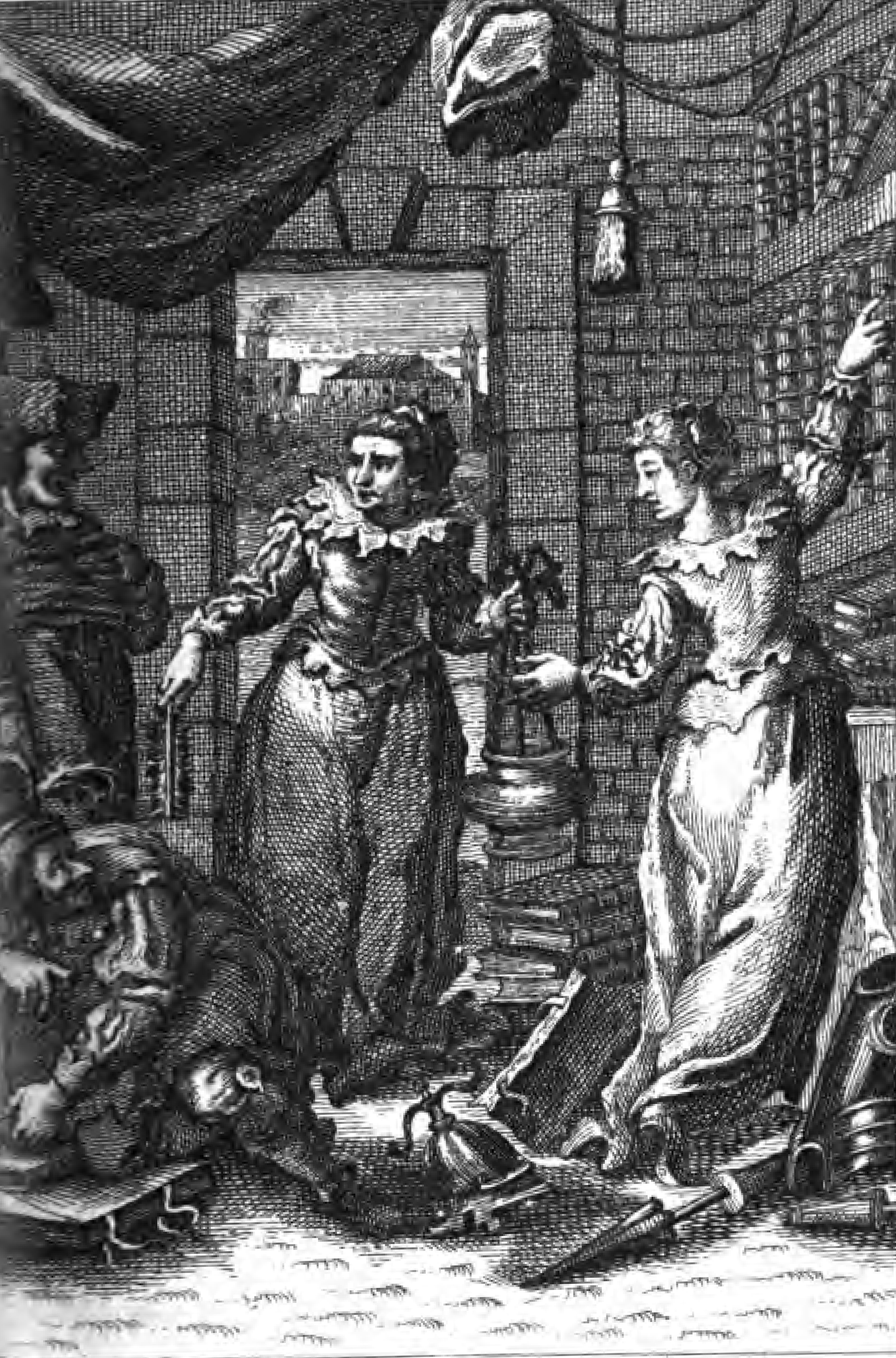 While Don Quixote sleeps, some of his closest acquaintances sneak into his library with the intention of burning all his books so that Quixote will not be influenced by them any longer. This company consists of the housekeeper (middle), Don Quixote's niece (right), the barber (left standing), the priest (left, holding the shepherd), and the shepherd Darinel. The housekeeper has brought with her a pot of holy water in her left hand and some sprigs of hyssop in her right hand in order to disenchant the books. Quixote's niece has begun pulling volumes off of the shelf to be burnt, and the priest, the barber, and the shepherd discuss the books before placing them in a pile to be burnt.