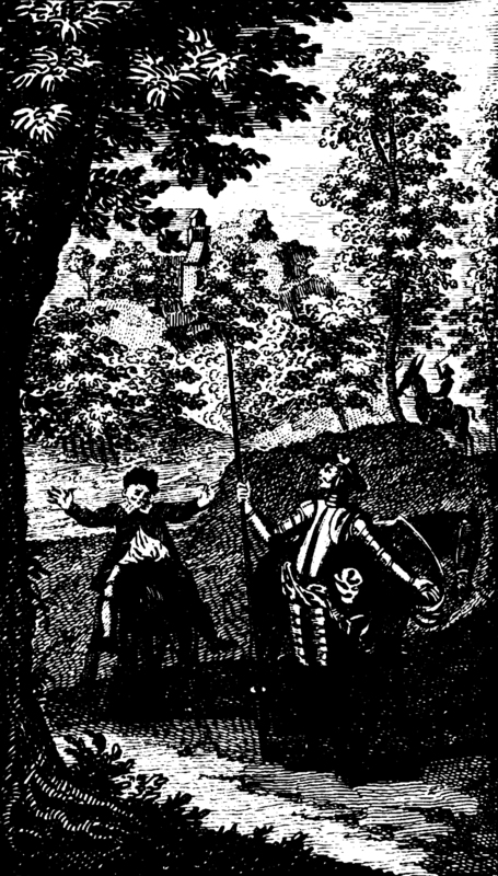 Don Quixote (pictured in his armour pointing his lance towards the sky) and Sancho Panza (pictured waking up to the horrible surprise that his donkey has been stolen) sleep in the heart of the Sierra Morena mountains, Sancho upon his donkey named Dapple, and Quixote upon his horse Rocinante. As they sleep they are visited by Gines de Passamonte (portrayed in the background of the image as a silhouette with a sword held high upon a donkey), the rogue who Quixote had freed from the galley. Passamonte lifts Sancho Panza from his donkey and places him on a saddle propped upon a post and steals the donkey for himself. As the sun rises Sancho Panza awakens to find his loyal donkey stolen from beneath him, leaving Sancho in a pitiable state. Quixote wakes up after hearing Sancho's sobs and unsuccesfully attempts to console his squire.