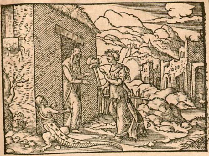 This engraving illustrates the goddess Ceres looking for her daughter, Proserpina, who had been abducted by Pluto, the god of the Underworld. Ceres becomes tired and thirsty from looking for her daughter, so she finds an old hut with a roof made of straw and asks the host for some hospitality. The host is an elderly woman who obliges the goddess and provides her with a drink. While Ceres is at this hut, a young, foul-mouthed boy named Stellio taunted the goddess and called her greedy. The goddess was taken aback by this rude child, and she threw her drink onto him which transformed him into a lizard. The young boy is depicted on the left side of the image with the lower half of his body already transformed into a lizard.