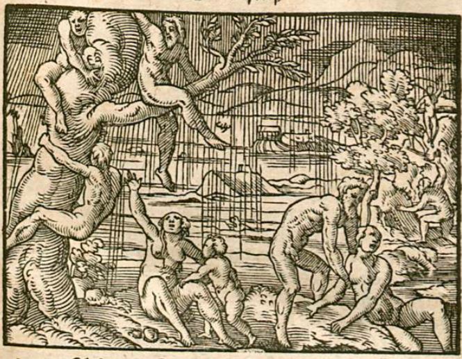 Jupiter, angry with the humans on earth, has decided to destroy them. He did not want to use his thunder bolts as he did not want to risk burning the heavens. Jupiter decided instead to send a flood to rid the world of humankind. This image depicts the flood sent by Jupiter. There are people attempting to climb trees in order to evade the water. There is a house in the background, however all that can be seen of the house is the roof in order to illustrate how high the flood has risen.