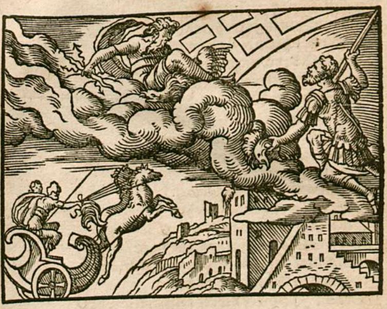 The god Mars is depicted on the right side of the engraving holding his helmet in his left hand and a spear in his right as he looks up to his father, Jupiter. Jupiter is identifiable as he is holding thunder bolts in his hand. Mars is pleading to his father to allow his son, Romulus, to become a god. Jupiter grants this request and Mars brings Romulus up into the sky in his chariot and they fly over Rome. Ovid explains that as Mars brings Romulus up into the sky, Romulus’ mortality dissolves while traveling through the atmosphere.