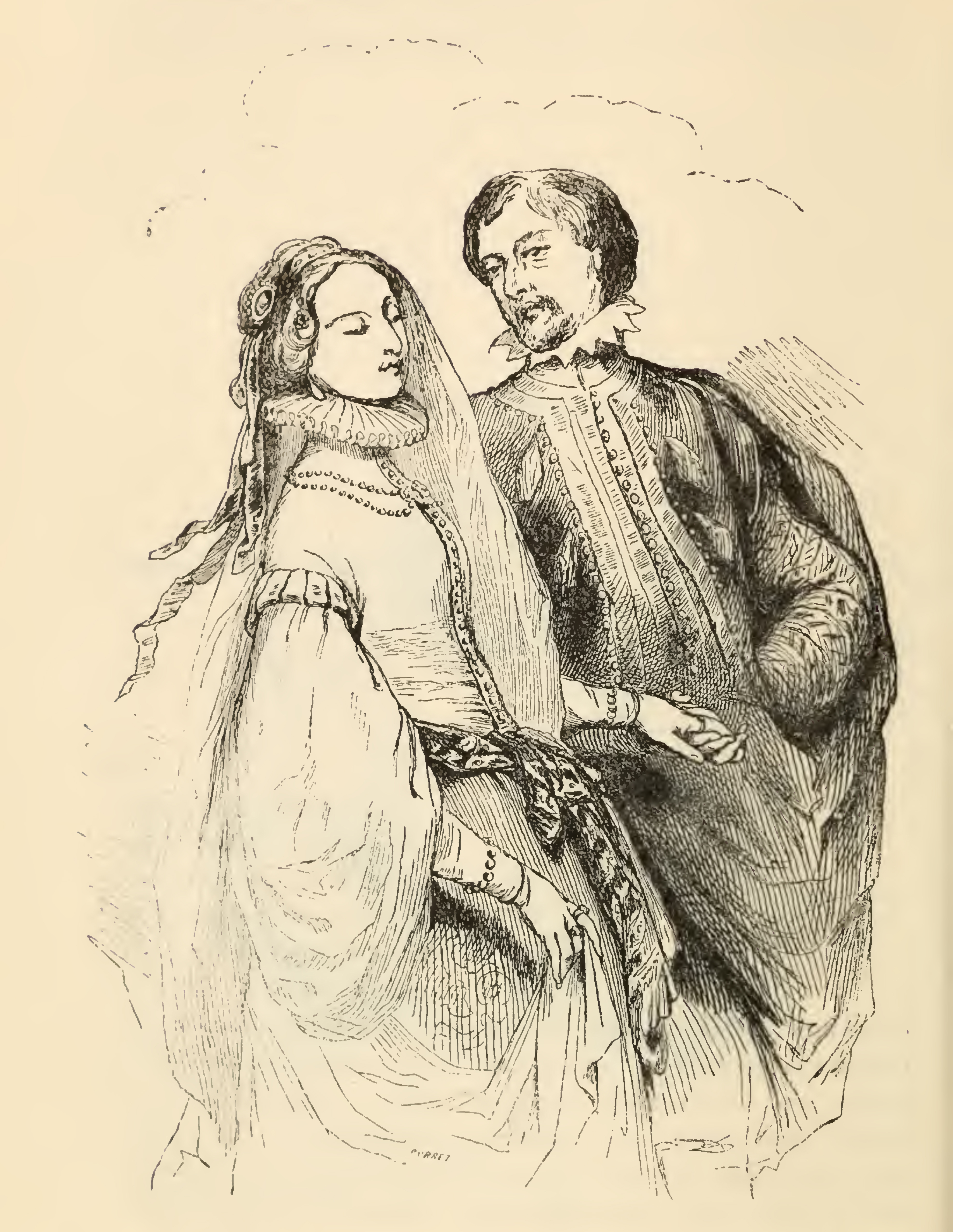 On the left Quiteria walks, her eyes closed wearing rich coral, and a courtly gown of velvet with trimmings of satin. On her hands are rings of jet and gold and adorned with pearls. Camacho (right) holds her hand, richly dressed in his own right. They are bride and bridegroom, proceeding towards their ceremony.