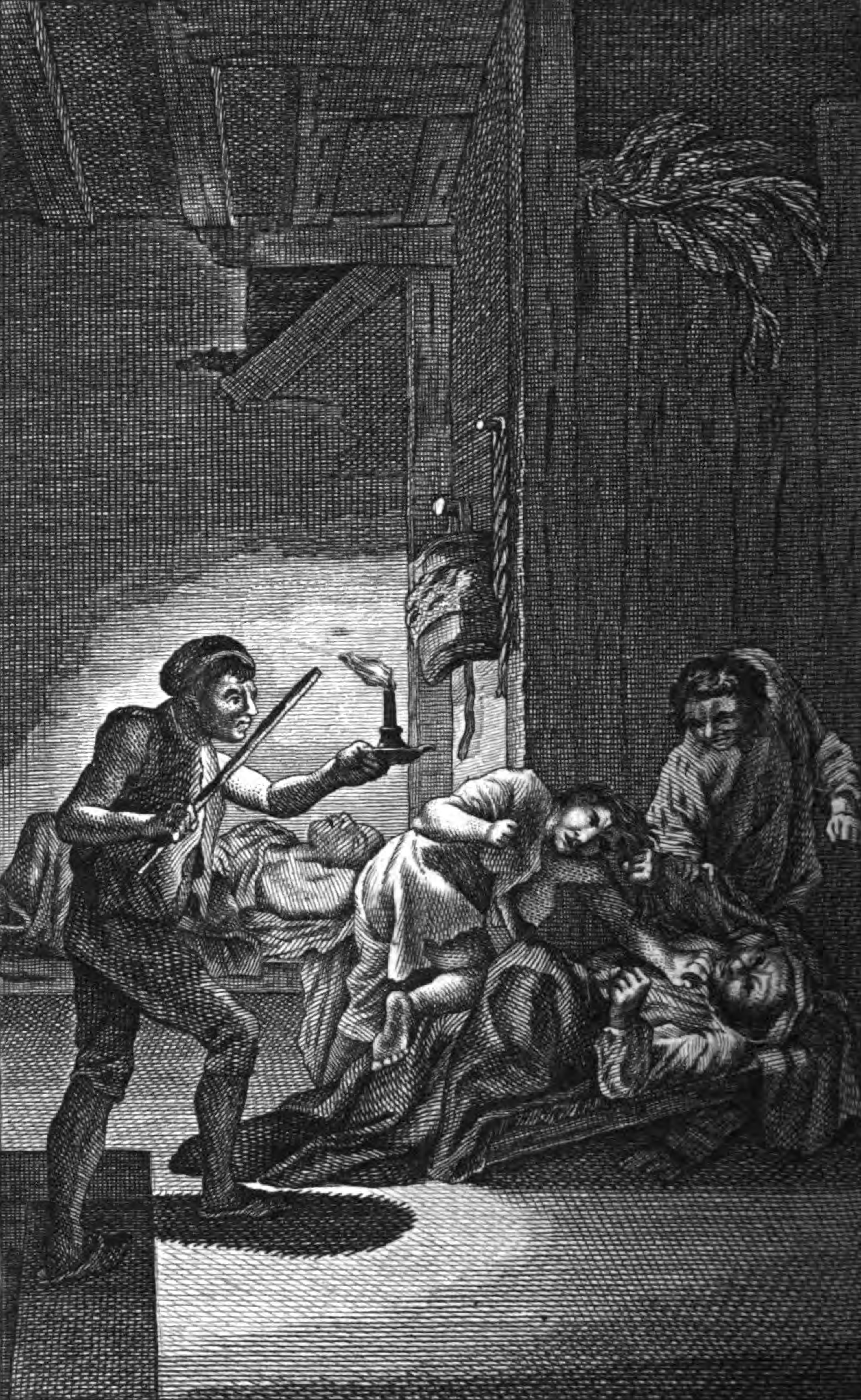 Don Quixote and Sancho Panza chance to lodge at the same an inn as a trooper of the Holy Brotherhood. Having angered a Carrier by trying to sleep with a female servant against her will, a skirmish ensues between the three of them, destroying Quixote's bed and extinguishing the lights in the process. Badly beaten during the scuffle, Quixote lies forlorn on the ground, as a trooper of the Holy Brotherhood enters the room with a candle in his left hand and a beating stick in his right. Seeing a member of the holy brotherhood, the female servant (pictured grabbing Quixote by the beard) and the carrier (pictured grabbing the servant girl by the hair) flee the scene. Upon seeing Quixote's forlorn visage strewed across the ground the trooper mistakes the knight-errant for dead. Meanwhile, Sancho Panza sleeps peacefully in the background.