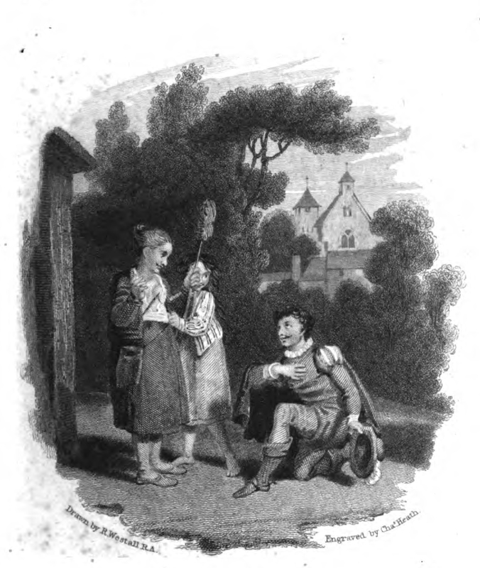 Led by Sancho's daughter (pictured grabbing her mother's arm), the page arriving at the Panza household, kneels on one leg, presses his right hand to his chest and holding aloft his feathered cap with his left hand and introduces himself. Teresa Panza (left), dressed in a grey pettticoat and bodice, stands before the page with a distaff of tow which she had been spinning in her left hand. In the background the village's church can be seen.
