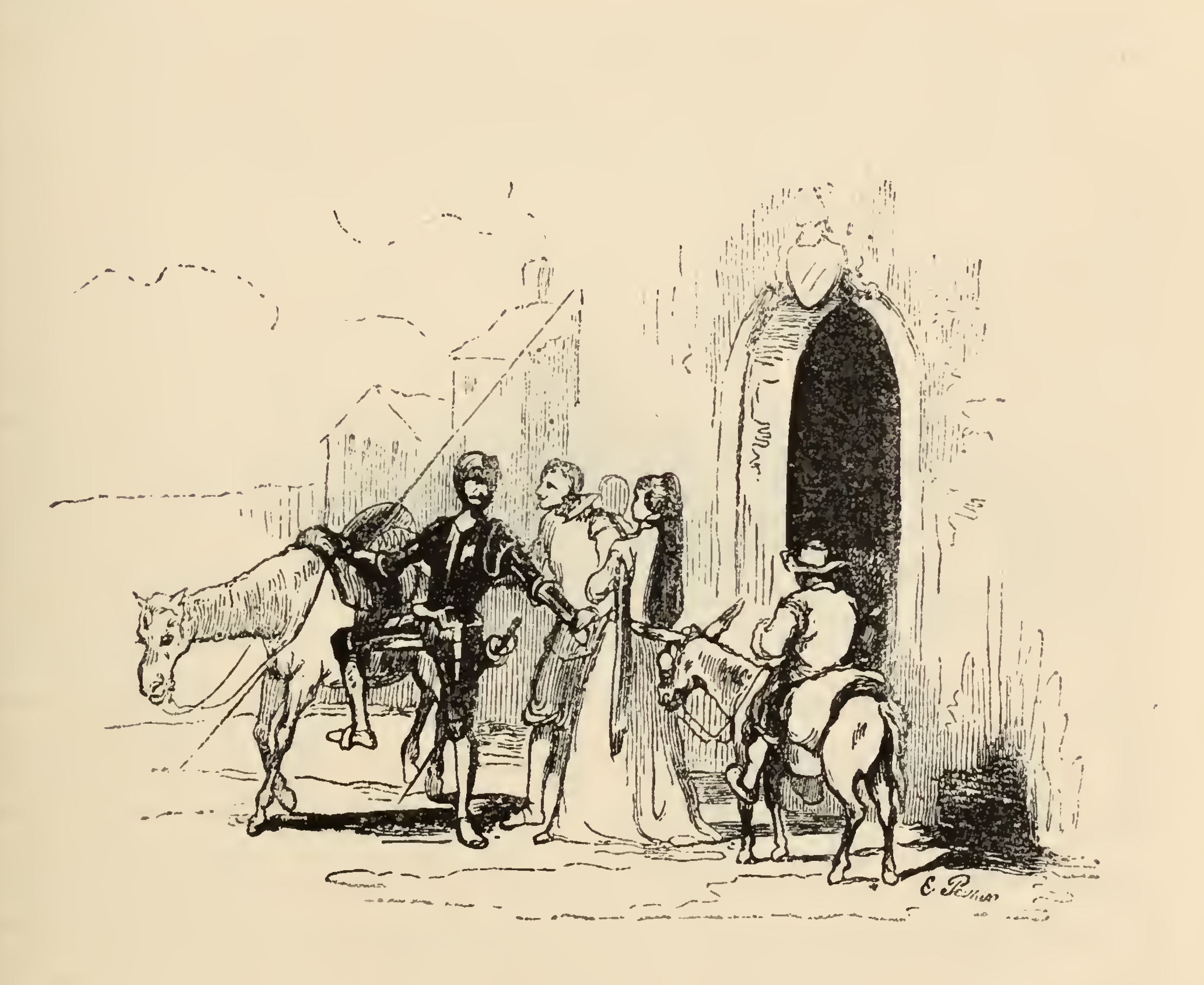 Don Quixote (left) clad in full armor, steps towards his horse, Rocinante, while also being held in farewell by Don Diego (middle) who leans to his ear to offer services and civilities. Donna Cristina, the lady of the castle (middle) bids farewell to Don Quixote as well. On the right Sancho Panza waits patiently upon his donkey for his master to be finished with farewells so they may depart. The doorway to the house on the left is very large and without a door, at the top of the arch is engraved Don Diego's coat of arms.