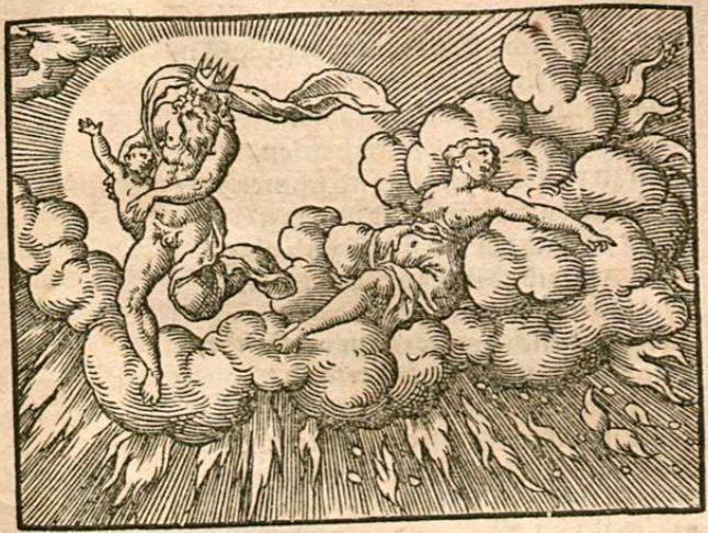 This engraving illustrates Semele, the daughter of Cadmus (founder of Thebes), being engulfed by the flames of Jupiter. She was unknowingly tricked by Juno into asking Jupiter to show his true godly form to her. Juno did this out of jealously, as she had found out that Semele was pregnant with a child from the seed of Jupiter. Semele followed the advice and requested Jupiter to show her his true form. Jupiter reluctantly did this, knowing it would incinerate her. The engraving shows the flames and storms that Jupiter’s full form unleashes unto Semele. Jupiter is depicted on the left-hand side of the engraving with his crown to signify his status as king of the gods. Once Semele was destroyed, Jupiter had taken the unborn child out of her womb in order to save him. He is illustrated with the child in his arms. He eventually sews the child into his thigh for him to finish developing. This child will become Bacchus, the god of wine and theatre.