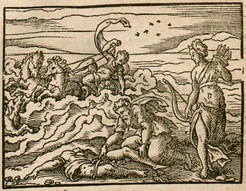 This engraving illustrates the death of Hippolytus, the son of Theseus. Hippolytus is illustrated in his horse-drawn chariot being overtaken by massive waves from the ocean. There is a bull coming out of the waves on the left side of the engraving directly in front of the horses. Hippolytus is depicted falling out of the chariot as he loses control of the horses. This accident kills Hippolytus. His mangled body is illustrated in the foreground of the engraving as he is being healed by the god Aesculapius. Diana is depicted standing beside Aesculapius with her bow and arrows. Ovid explains that Diana helped Hippolytus find a new life and home after he was healed.