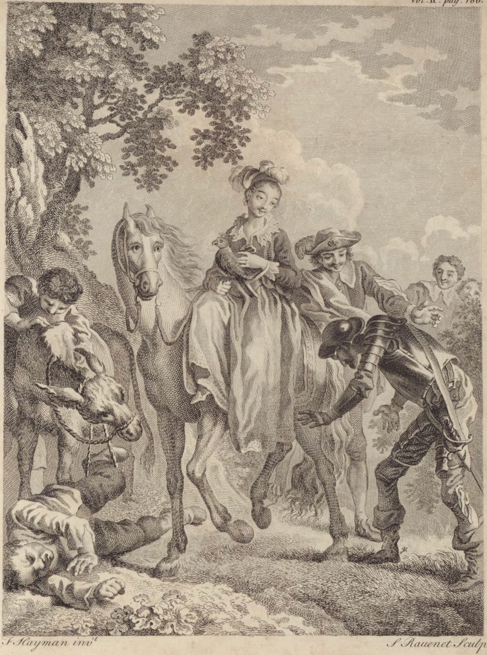 Don Quixote introduces himself to the duchess, who rides a white horse and holds a goshawk. He bows to her while Sancho Panza lies fallen from his mount. The duchess is accompanied by several squires. Signed by F. Hayman (illustrator) and S. F. Ravenet (engraver). Part 2, ch. 30.