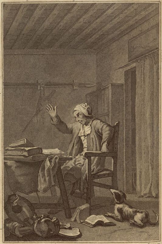 - Don Quixote reads chivalric books in his library, slowly descending into madness. Anecdotal detail from Cervantes’ text: skinny greyhound at Don Quixote’s feet. Signed by W. Byrne (engraver). Part 1, ch. 1.