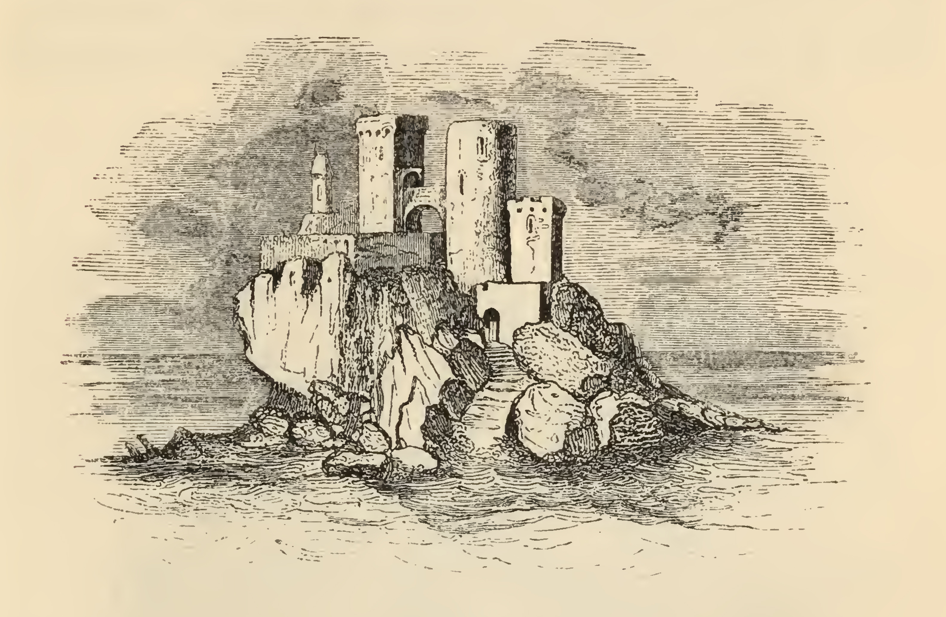 A stone castle is pictured atop a peninsula of rock, surrounded on all sides by water, the only entrance a winding pathway drawing from a beach. The image is occasioned by Quixote seeing a water mill and saying "O friend, behold, yonder appears the city, castle or fortress in which some knight lies under oppression, or some queen or princess in evil plight, for whose relief I am brought hither."