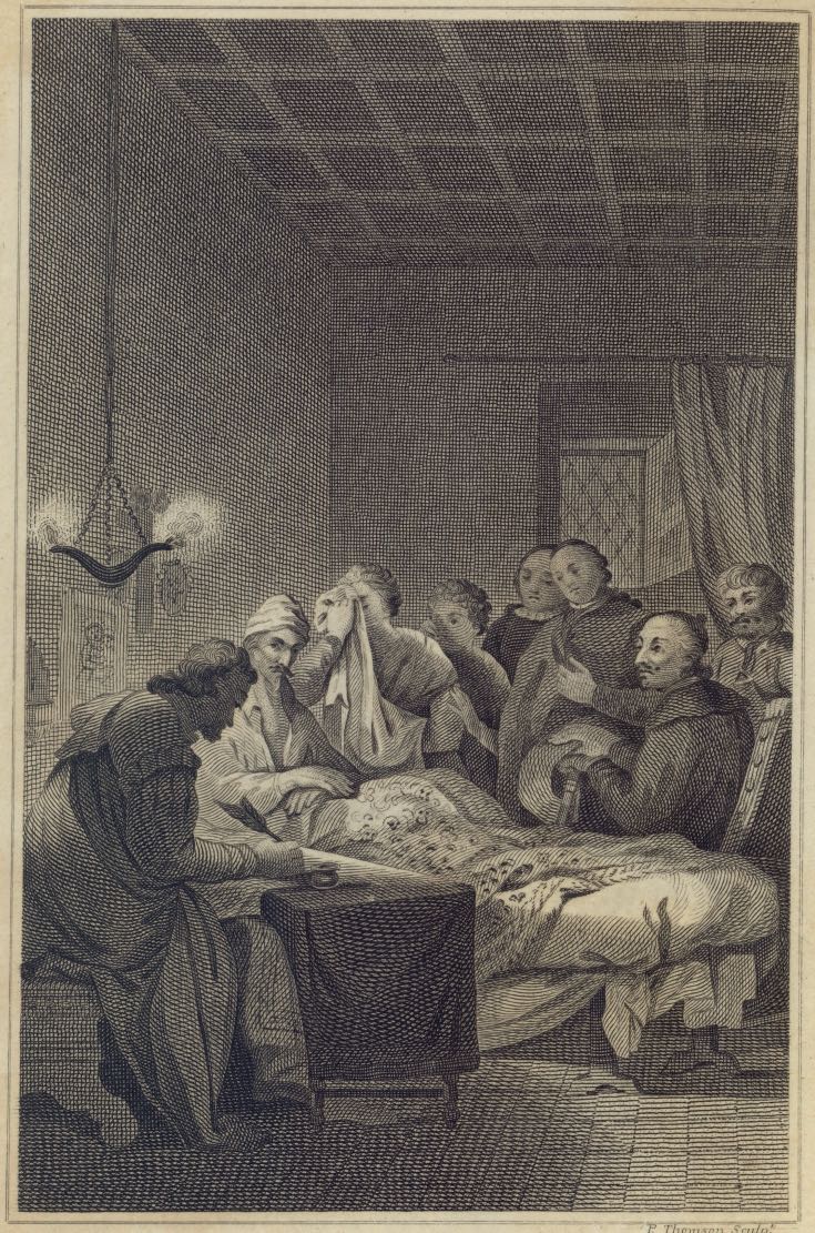 From his bed, Don Quixote dictates his last will to a notary (foreground). Also pictured are Sancho Panza, Sansón Carrasco, the housekeeper, the priest, and the niece. Signed by P. Thomson (engraver). Part 2, ch. 74.