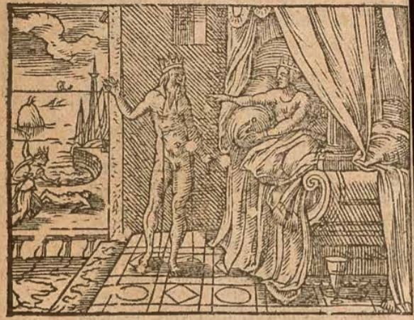 This engraving illustrates Morpheus, the son of the god of sleep, appearing to Alcyone in a dream in the form of King Ceyx. Unbeknownst to Alcyone, her husband King Ceyx of Thessaly had died in a shipwreck. She constantly prayed to the goddess Juno for her husband’s safe return, however, Juno wanted to reveal to Alcyone that he was in fact dead. Juno sent her messenger, Iris, to the god of Sleep and told him to appear to Alcyone in a dream to reveal her husband’s death. The god of sleep sent his son Morpheus to handle the task, as he can shape shift into any human being. As depicted in the engraving, Morpheus took the form of a dead King Ceyx, and appeared to Alcyone to reveal his death. Alcyone is illustrated pointing at him as she is surprised by his appearance and grieved to know that he is dead. The background of the engraving illustrates Alcyone after she has woken from her dream. She walked along the shores and came across the washed-up body of King Ceyx on the shores of the beach. She is depicted with her arms in the air, about to throw herself onto the body of her husband.