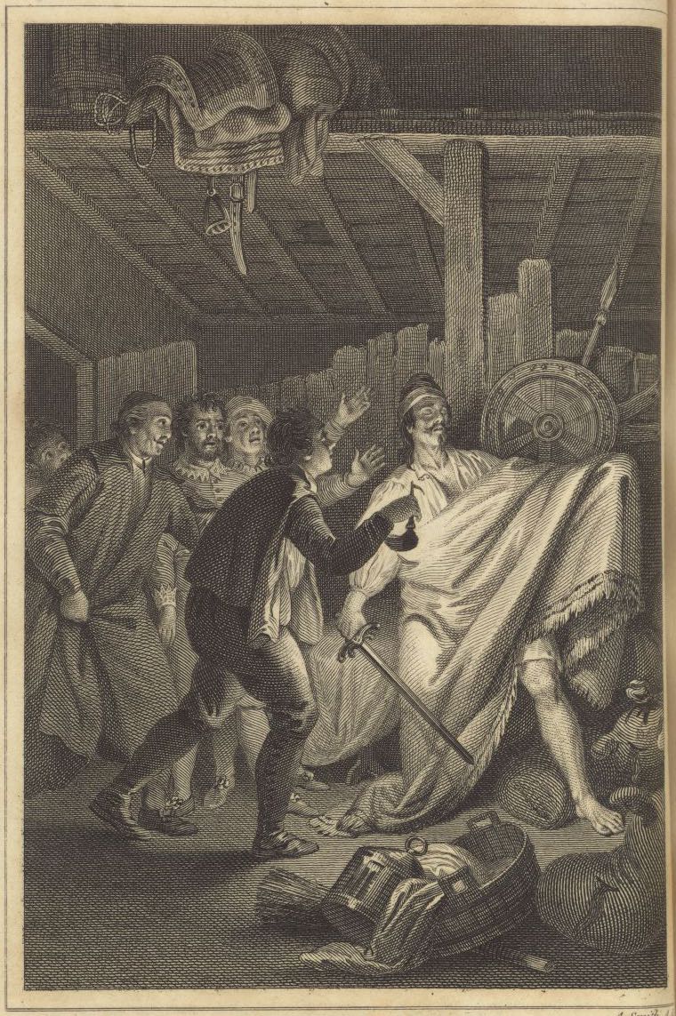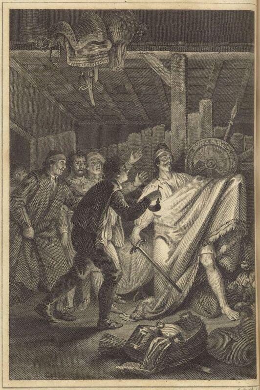 At Juan Palomeque’s inn, Sancho Panza, Cardenio, the priest, and the innkeeper discover Don Quixote attacking the wineskins while sleepwalking. He is half-dressed, has a blanket draped over his arm, and wields his sword. The light from a lamp held by the innkeeper illuminates the scene. Signed by A. Smith (engraver). Part 1, ch. 35.