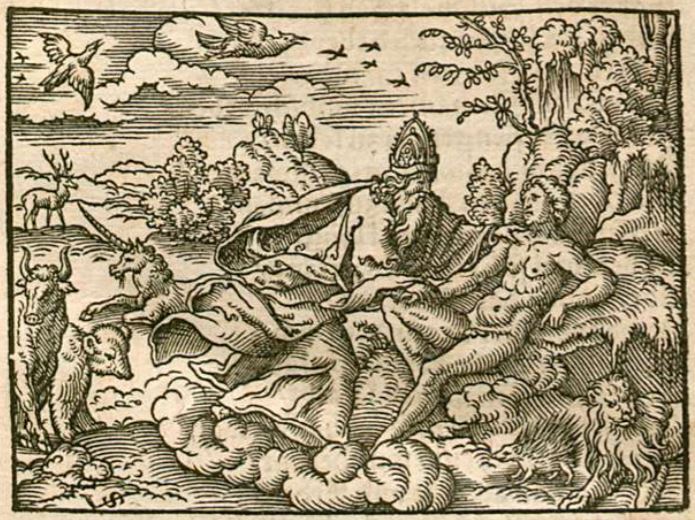 This image illustrates the creation of the first human. There is a god in the center of the image with his clothing blowing in his newly created winds. Depicted behind him are the all the animals he had just created as well. His hands are touching his new creation: humankind. According to Ovid, this god wanted to create a being with higher intelligence than any of the animals he had made, as well as a being that had their heads pointed to the skies, as opposed to the ground beneath them. The human is depicted nude, with his gaze pointing upwards towards the sky.