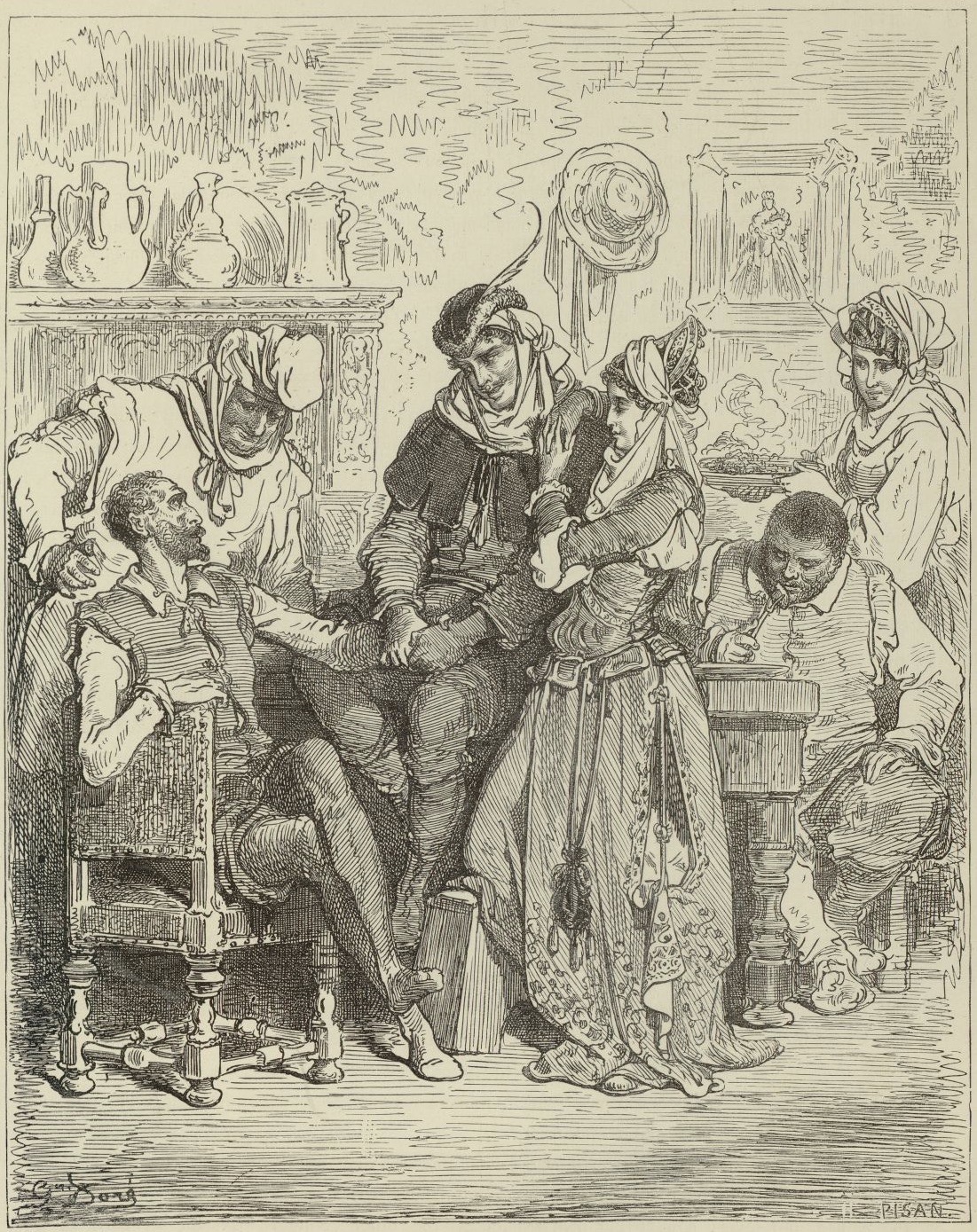 The newlyweds Basilio and Quiteria host Don Quixote and Sancho Panza at their house for three days and present many gifts to the knight. They are depicted in the kitchen, where Don Quixote gives them advice while Sancho eats. Signed by G. Doré (illustrator) and H.-J. Pisan (engraver). Part 2, ch. 22.
