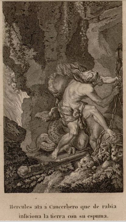 Hercules ala a Cancerbero que de rabia inficiona la tierra con su espuma
