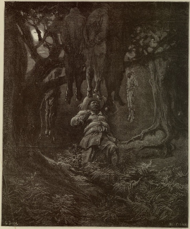 After his brief fight with Don Quixote, Sancho Panza discovers the bodies of outlaws and bandits hanging from tree branches. He shouts, calling for Don Quixote to help him. Signed by G. Doré (illustrator) and H.-J. Pisan (engraver). Part 2, ch. 60.