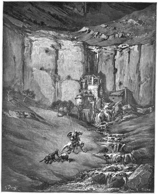 Don Quixote attempts to find the source of the loud noises coming from the river that had kept Sancho Panza and himself awake with fear all night. Rocinante was scared of the noises, which turned out to be made by the mills powered with the running water. The illustration shows Don Quixote urging Rocinante onwards towards the river while Sancho and his donkey follow timidly behind. The mills are nestled into the cliff and the river flows out of them towards the foreground. This scene can be found in Part I, Book 3, Chapter 6.