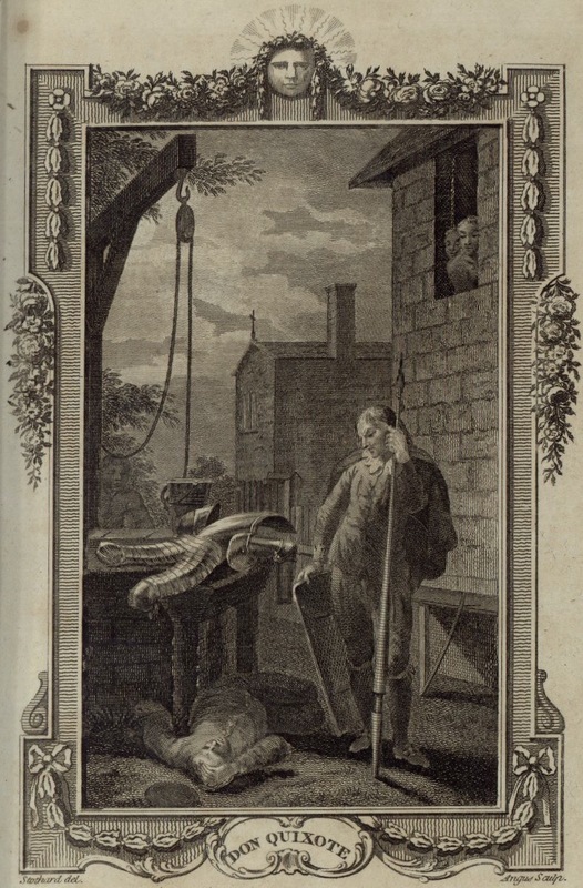As night falls, Don Quixote gathers his armour and places it on a trough next to a well in a corral near the inn. Taking up his lance, he paces back and forth in front of the trough, standing vigil over his arms. The scene is illuminated by the light of a full moon. Approached by one of the muleteers, Don Quixote orders him not to touch his arms. When the muleteer ignores him, the errant knight knocks him to the ground. Signed by T. Stothard (illustrator) and W. Angus (engraver). Plate XII. Part 1, ch. 3.
