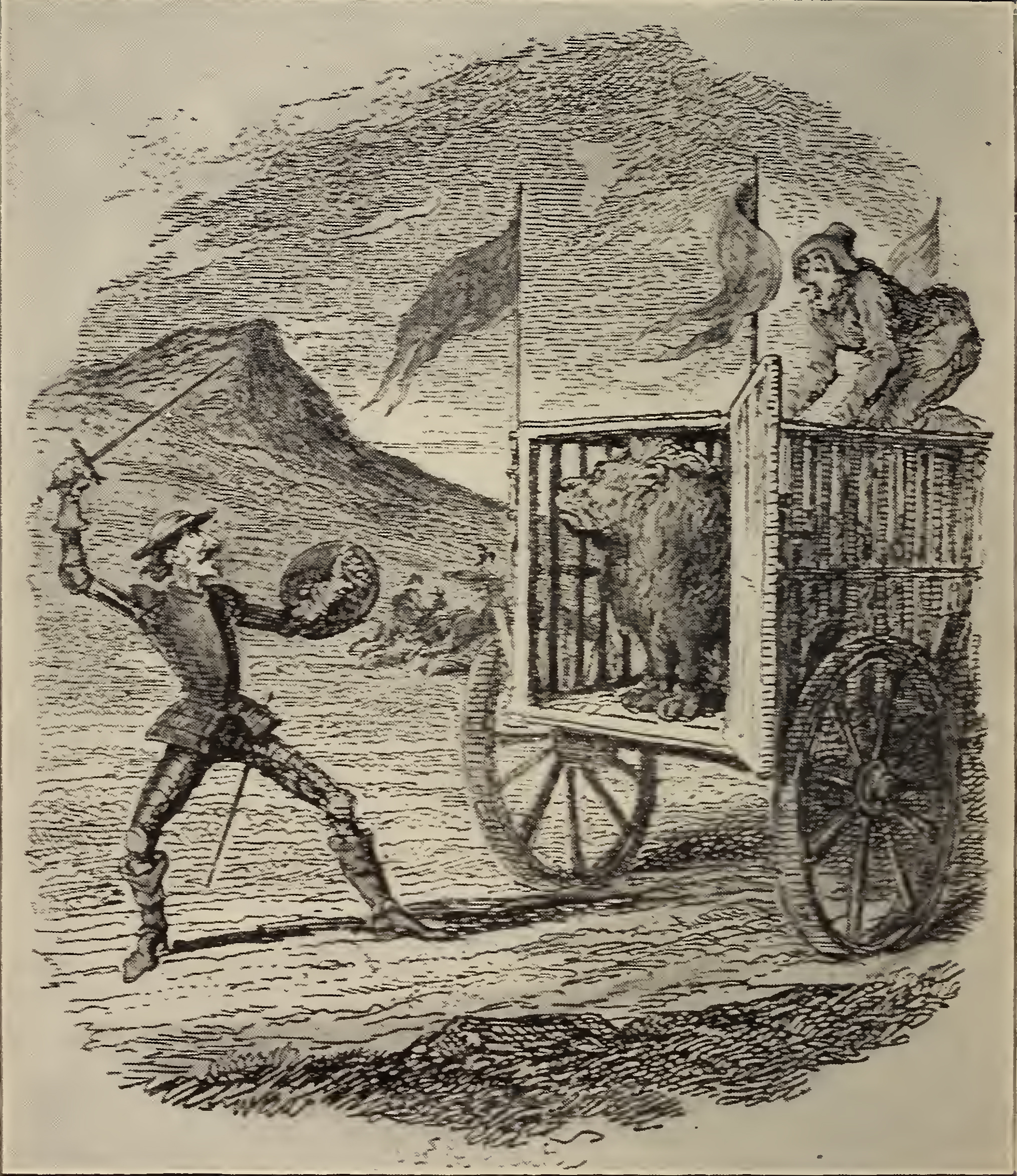 Don Quixote meets a lion keeper during his travels and ceases the opportunity to bolster his chivalrous reputation and become the 'knight of the lions' . The lion keeper is frightened by Quixote's preposition to release the lions from their cages and remarks that the lions are very large and very hungry. Quixote is unperturbed by this knowledge and threatens the keeper with his lance, forcing him to open the cages so he can fight the lions. Sufficiently intimidated, the lion keeper opens the lion cage and cowers atop the cage. As Quixote assumes a fighting stance with which to battle, the lion coolly stands up, passively observes its surrounding and shows no interest in escaping the cage or attacking the knight.